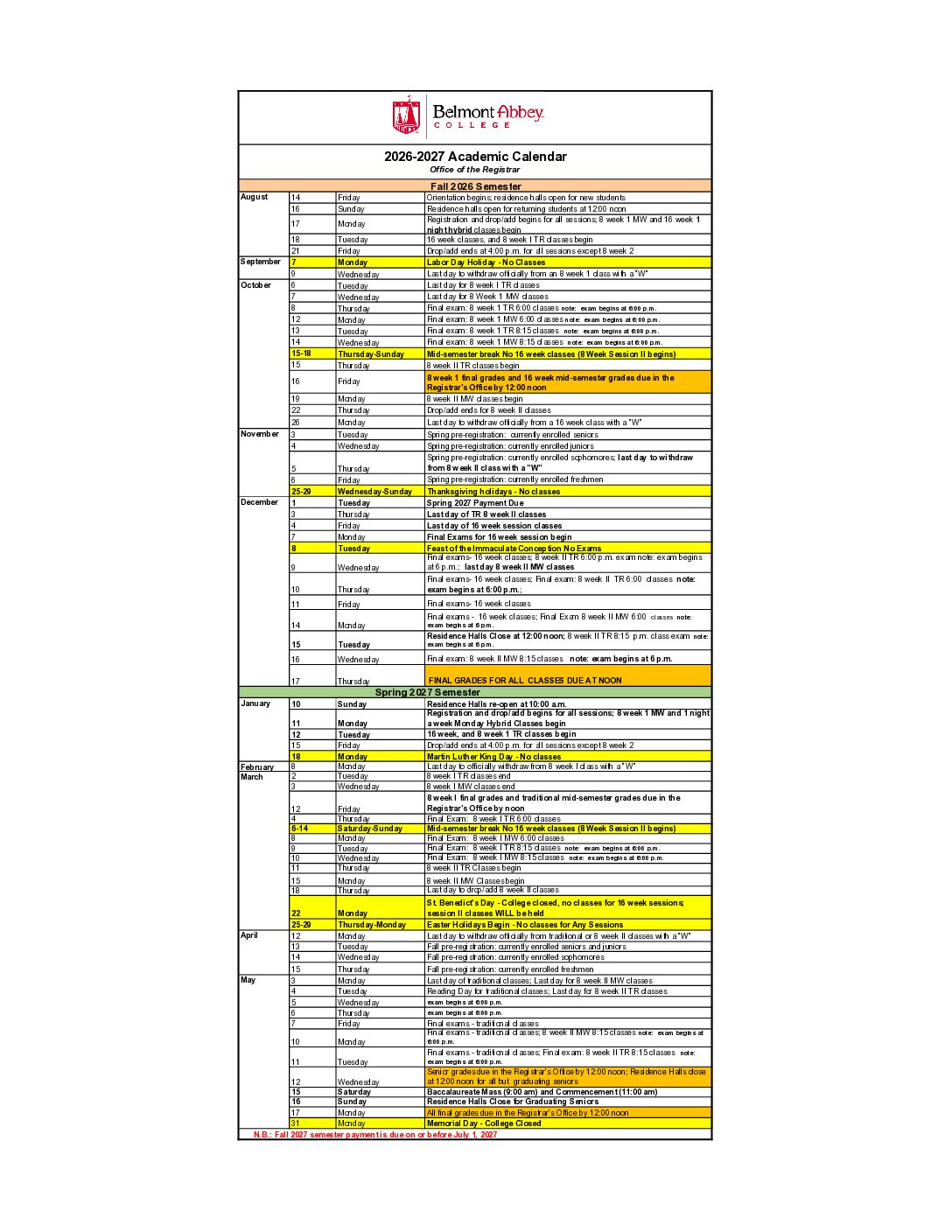 | N.B.: Fall 2027 semester payment is due on or before July 1, 2027 | |||
